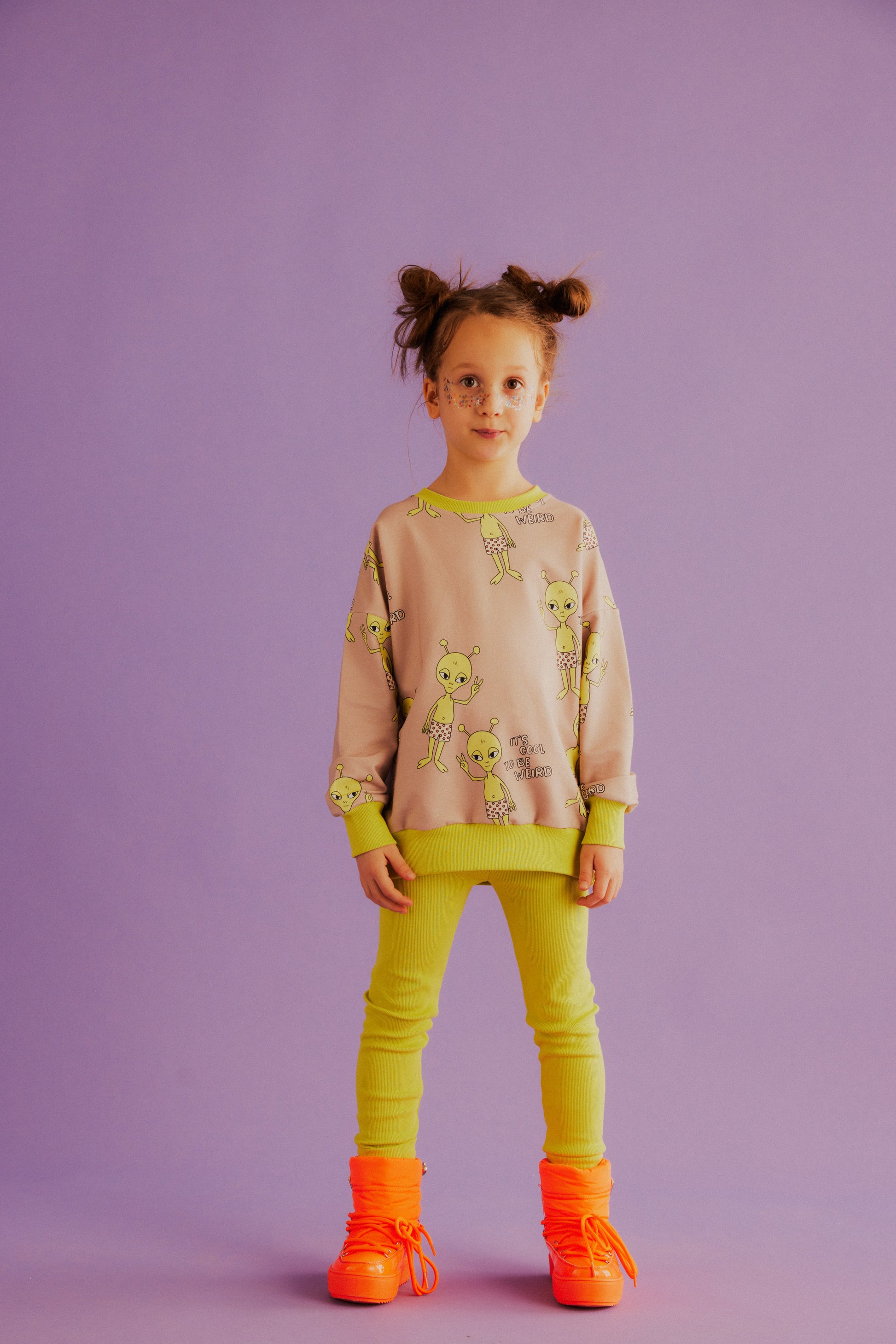 We totally get that some kids may prefer garment without a hood. We also believe that parents may want to get some styles for their Little Ones that complement hoodies they already wear. Here is our answer: all-over-printed sweatshirt sewn from soft, premium organic cotton. Casual and comfy outfit with both plain, basic bottoms as well as those printed ones - the length of this garment is suitable for pants, leggings, jeans, shorts and bikers. Try a cool girly look of that sweatshirt with skirt and sneakers or boots. What is different from other sweatshirts is shape of this garment - the one you're looking at is more relaxed and its sleeves are slightly dropped. Finished with DEAR SOPHIE black label on the back.