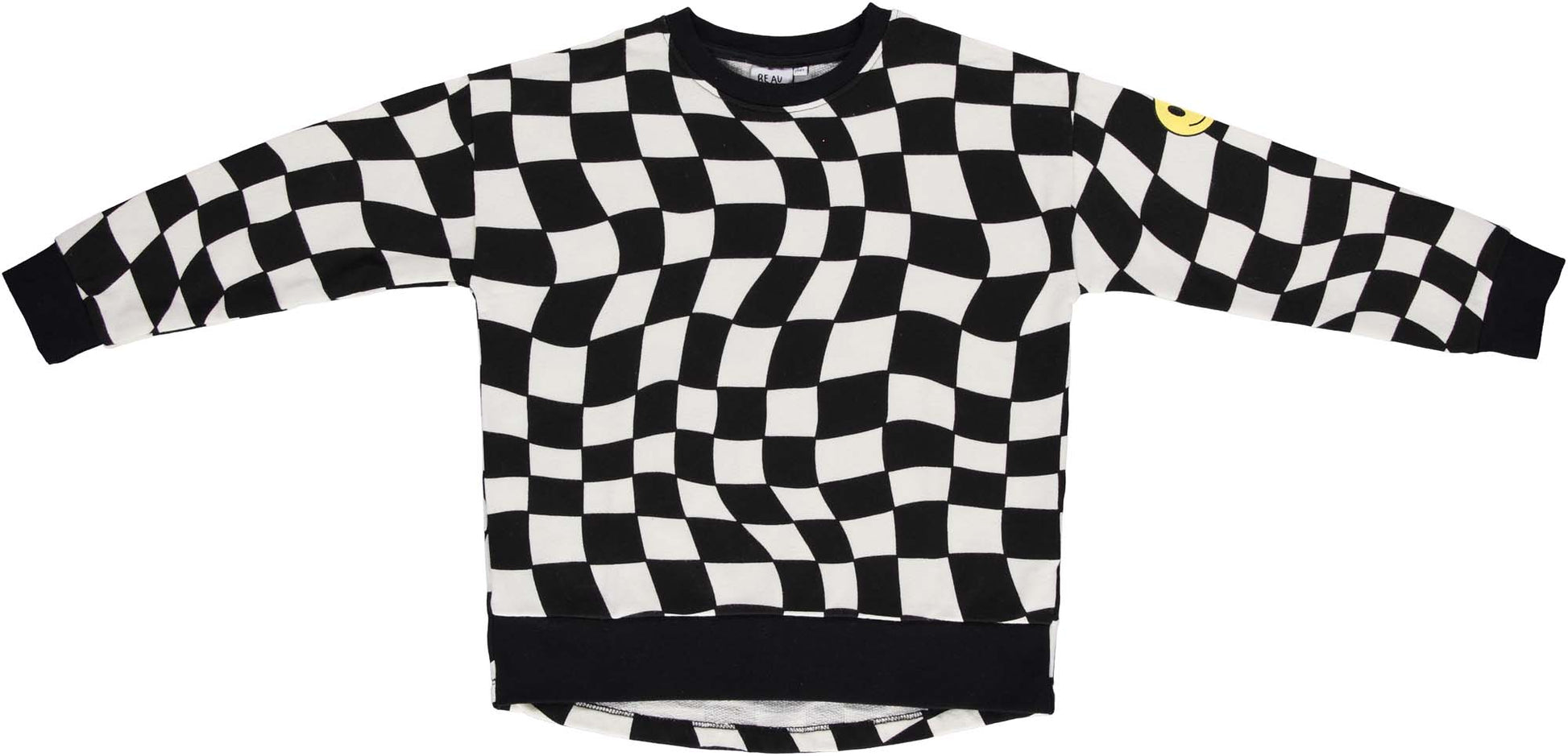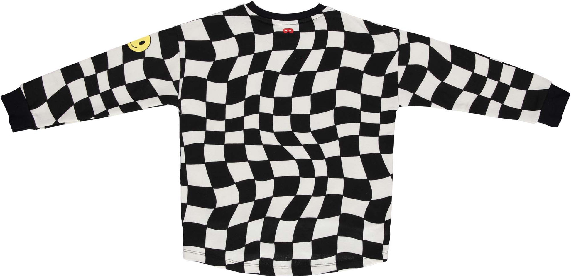This summer weight, relaxed fit sweatshirt is printed with a rippled check which has been designed to imitate the distorted pattern seen at the bottom of a swimming pool. Made from organic recycled fabric, it features a dipped hem, dropped shoulders and ribbed cuffs. Our signature embroidered superhero mask is at the nape of the neck.