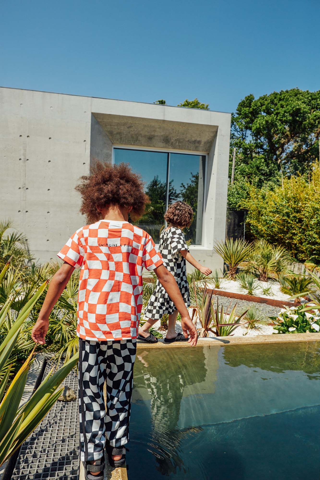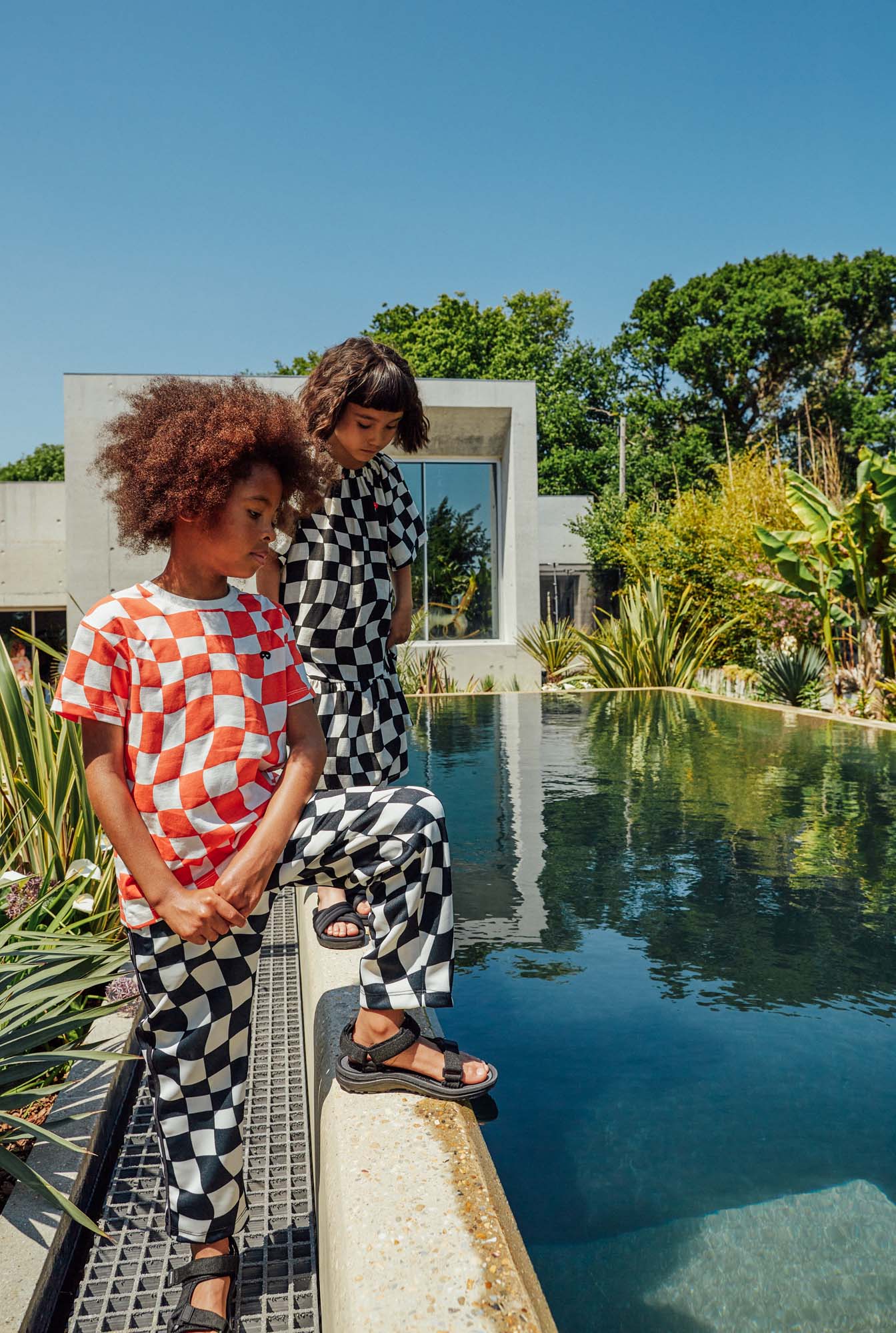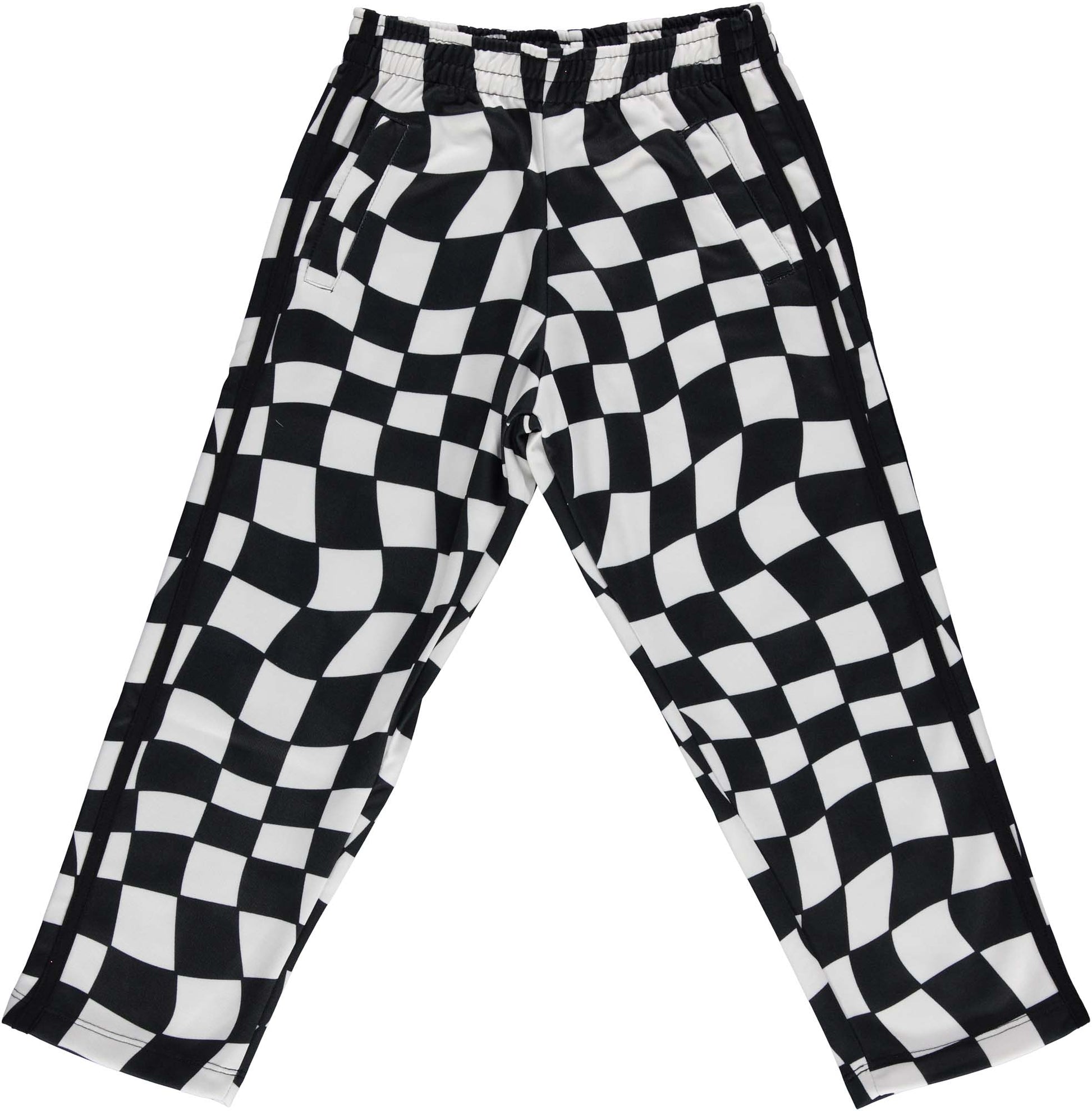 Our straight leg sweatpants have a relaxed, roomy fit, and an elasticated waist and cuff hems make them a comfortable option for freewheeling explorers. Printed with a rippled check which has been designed to imitate the distorted pattern seen at the bottom of a swimming pool, they are easy to wear and easy to care for. Great for mixing and matching. Go have fun!