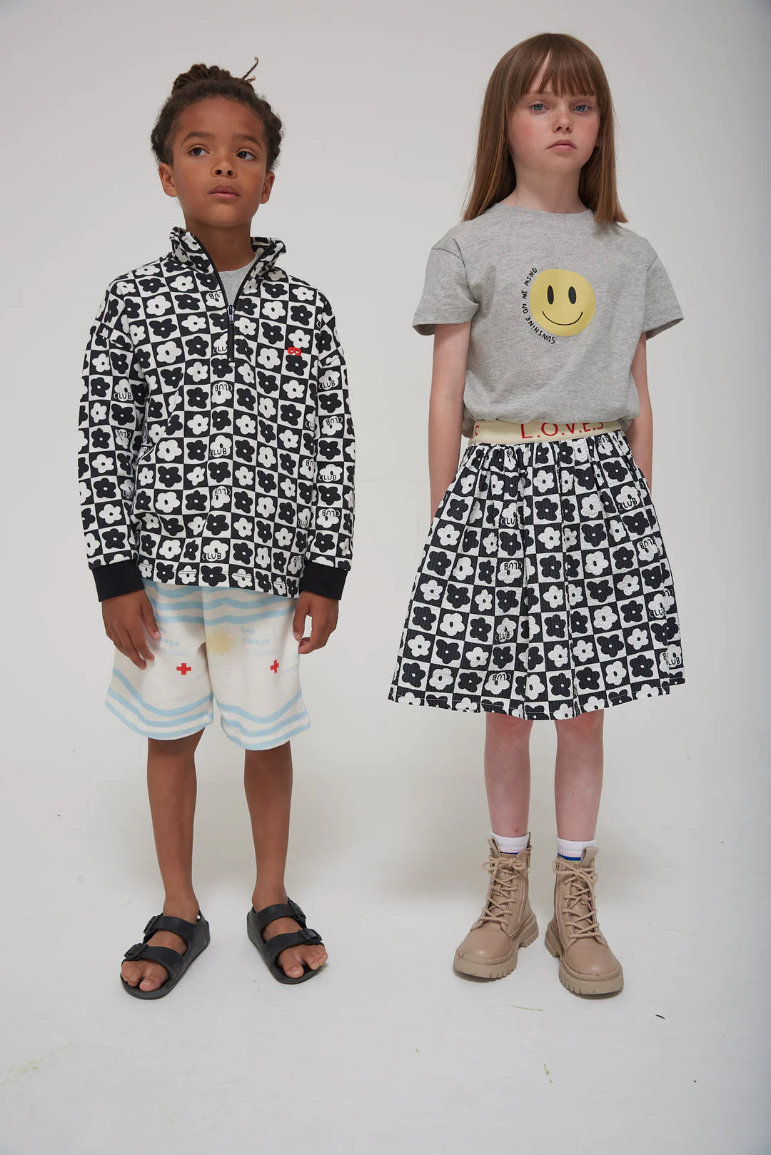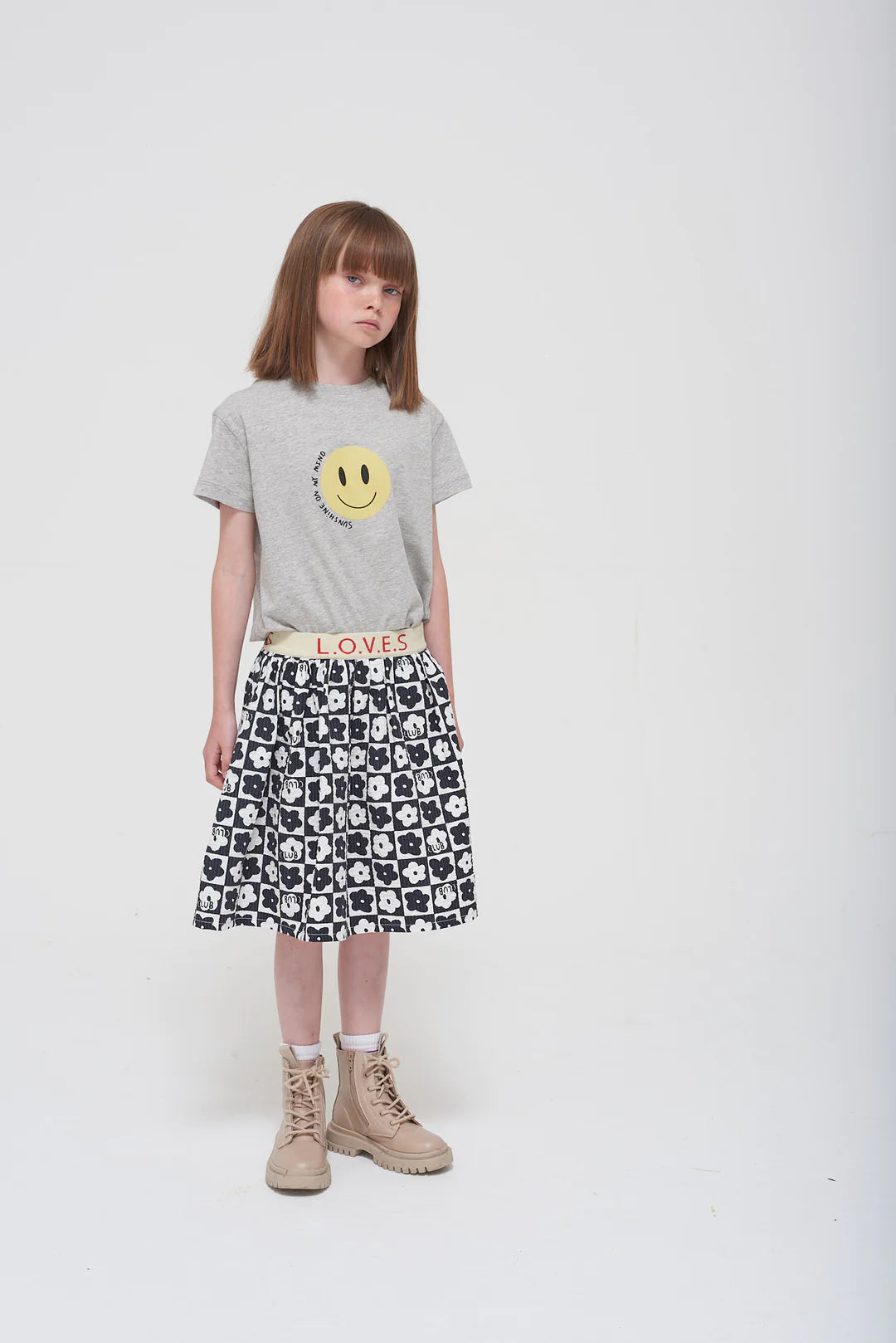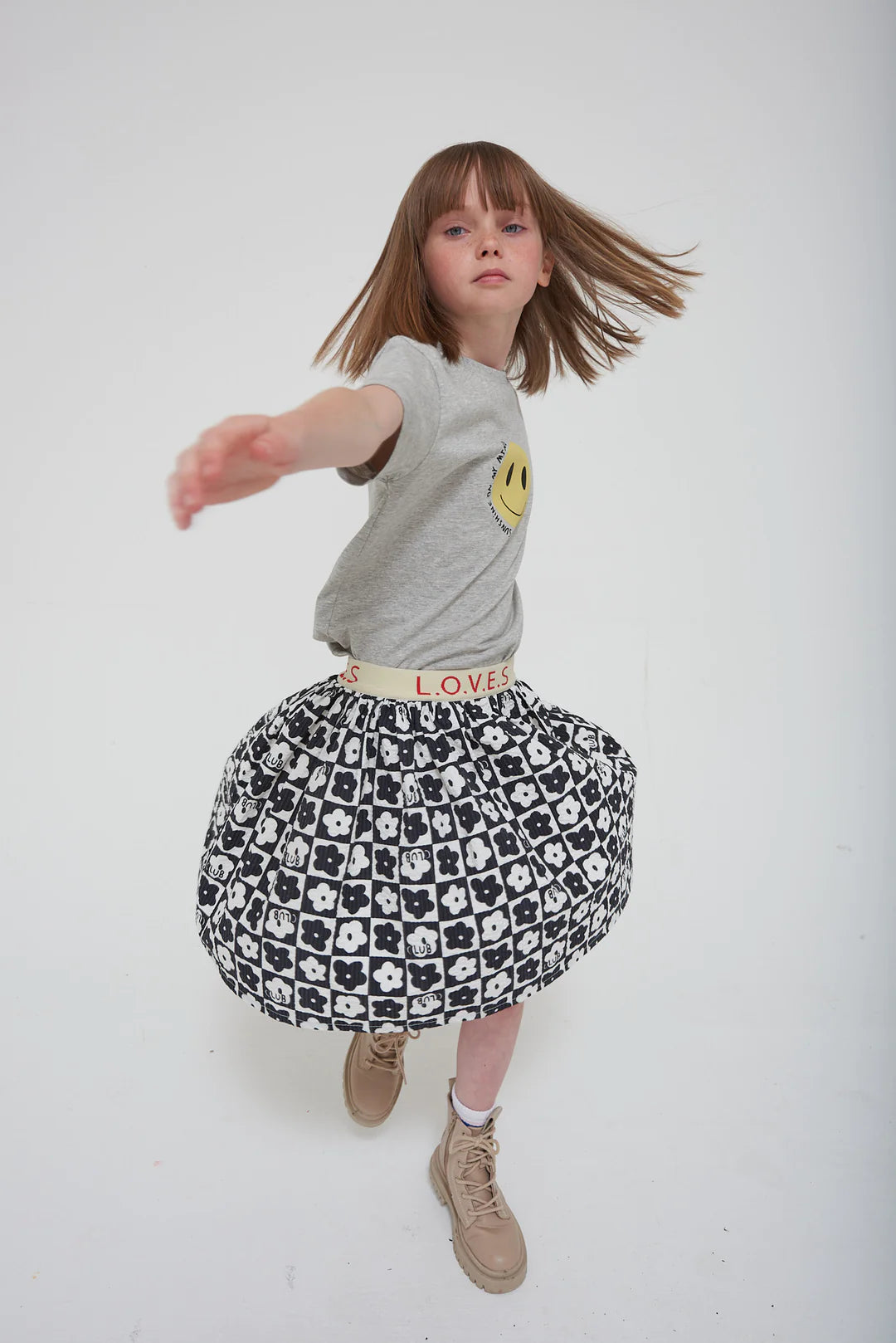 Time for an adventure in our cute chequerboard print. This organic jersey skirt falls just above the knee - perfect for twirling in. A natural waistband in jacquard elastic features bold, red ‘LOVES' text.