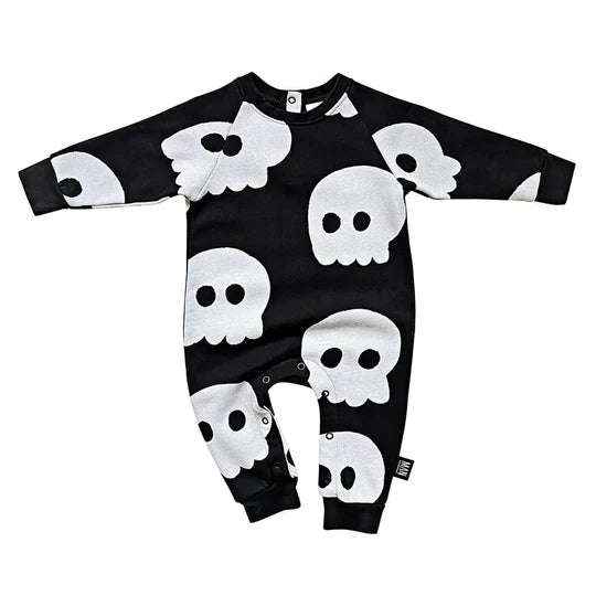 Soft comfortable relaxed fitted skull baby jumpsuit. Made of organic cotton.