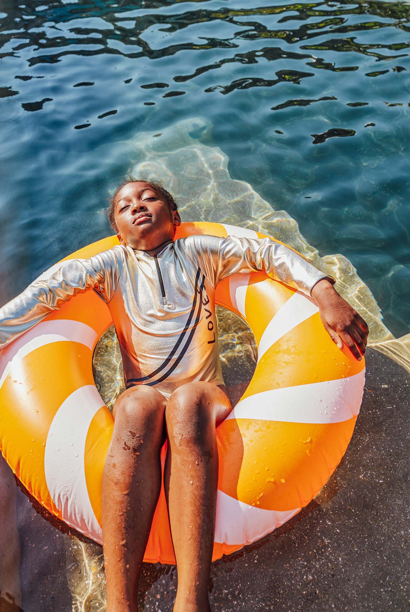 Stand out while being protected in our long sleeved, zip front gold swimsuit. A double sea wave snakes across this swimsuit along with 'LOVES' and '2010', the year Beau Loves started out.