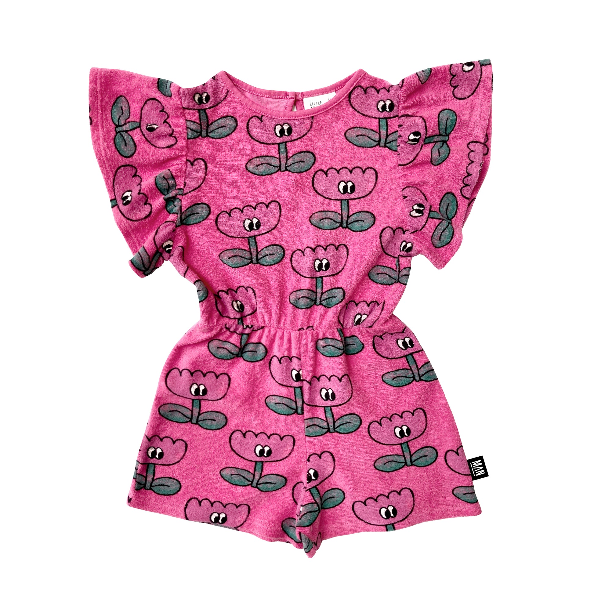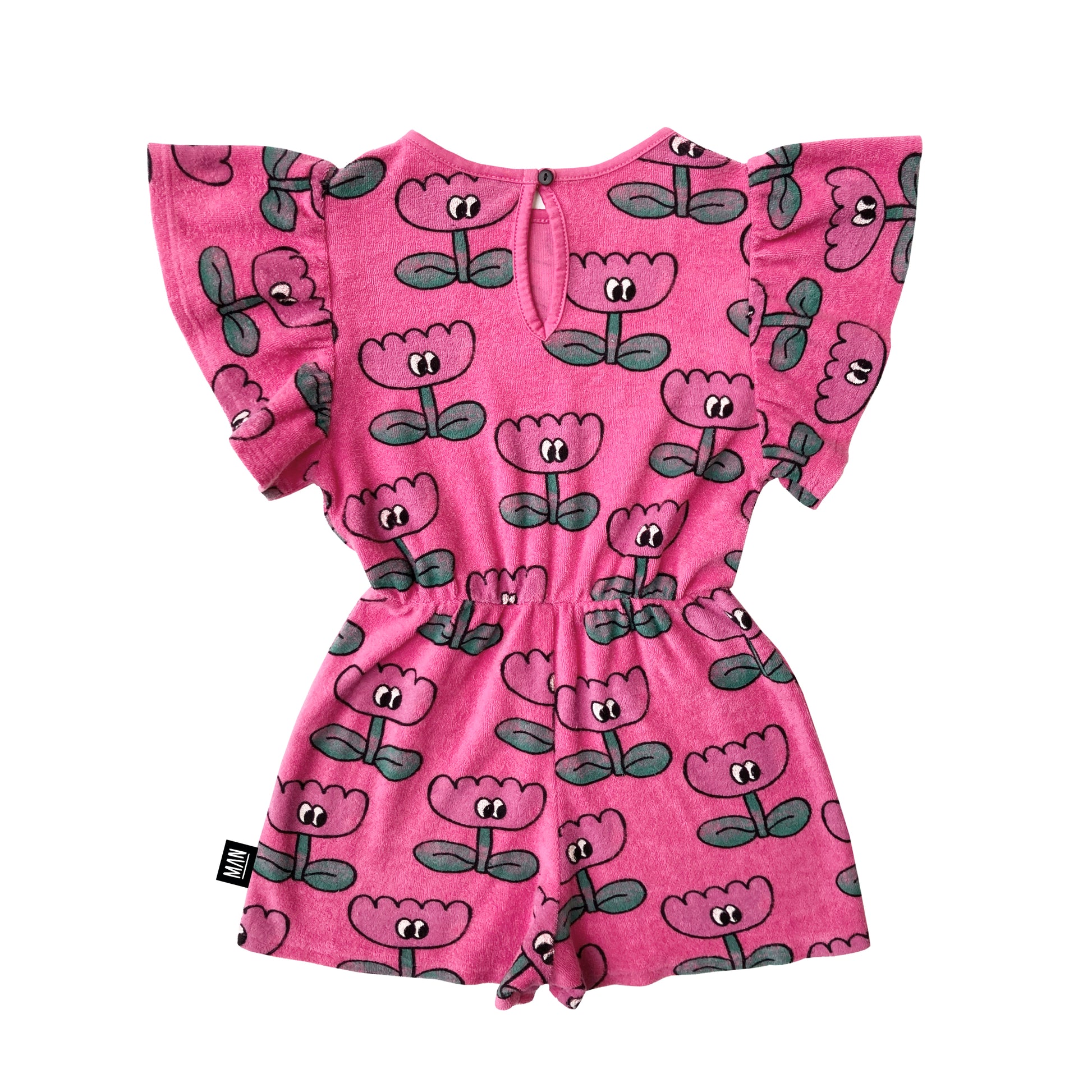Detail: round neckline, frilled sleeves, elasticated waist, keyhole button closure at back