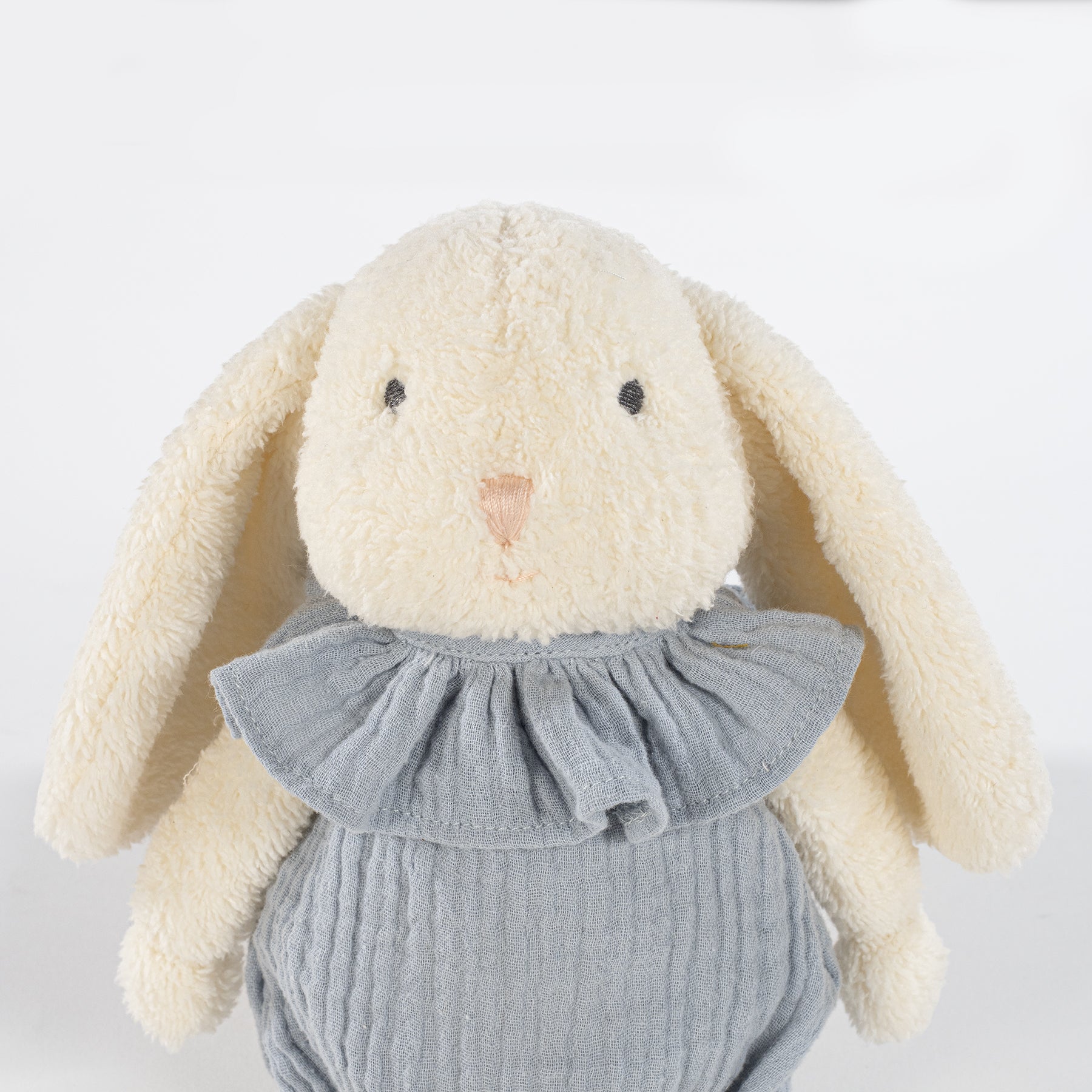 Stuffed plush rabbit with sand color dress for the baby. Extreme quality, very soft and with a very nice texture. His eyes are embroidered guaranteeing the safety of your baby. Manufactured under EN-71 toy safety regulations. Measurements: 34 cm