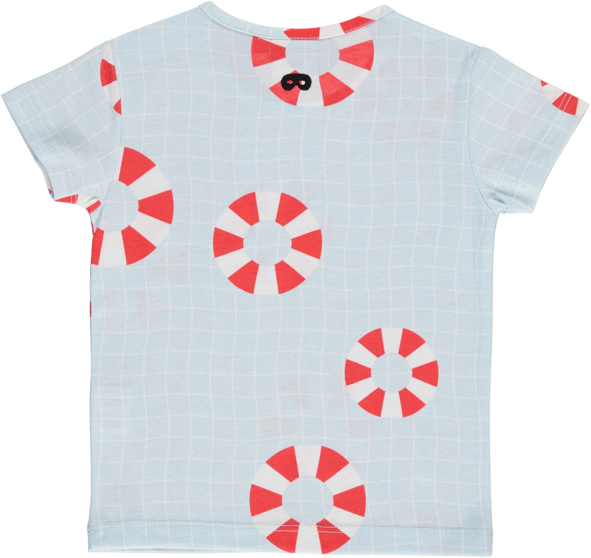 This baby t-shirt features our hand-drawn tiled pool print complete with striped rubber rings on a fluid blue base. Our signature superhero mask is embroidered at the nape of the neck and there are two press buttons on the shoulder to make dressing easy. With short sleeves, a scoop neck and soft, organic cotton, this is the perfect t-shirt for baby explorers.