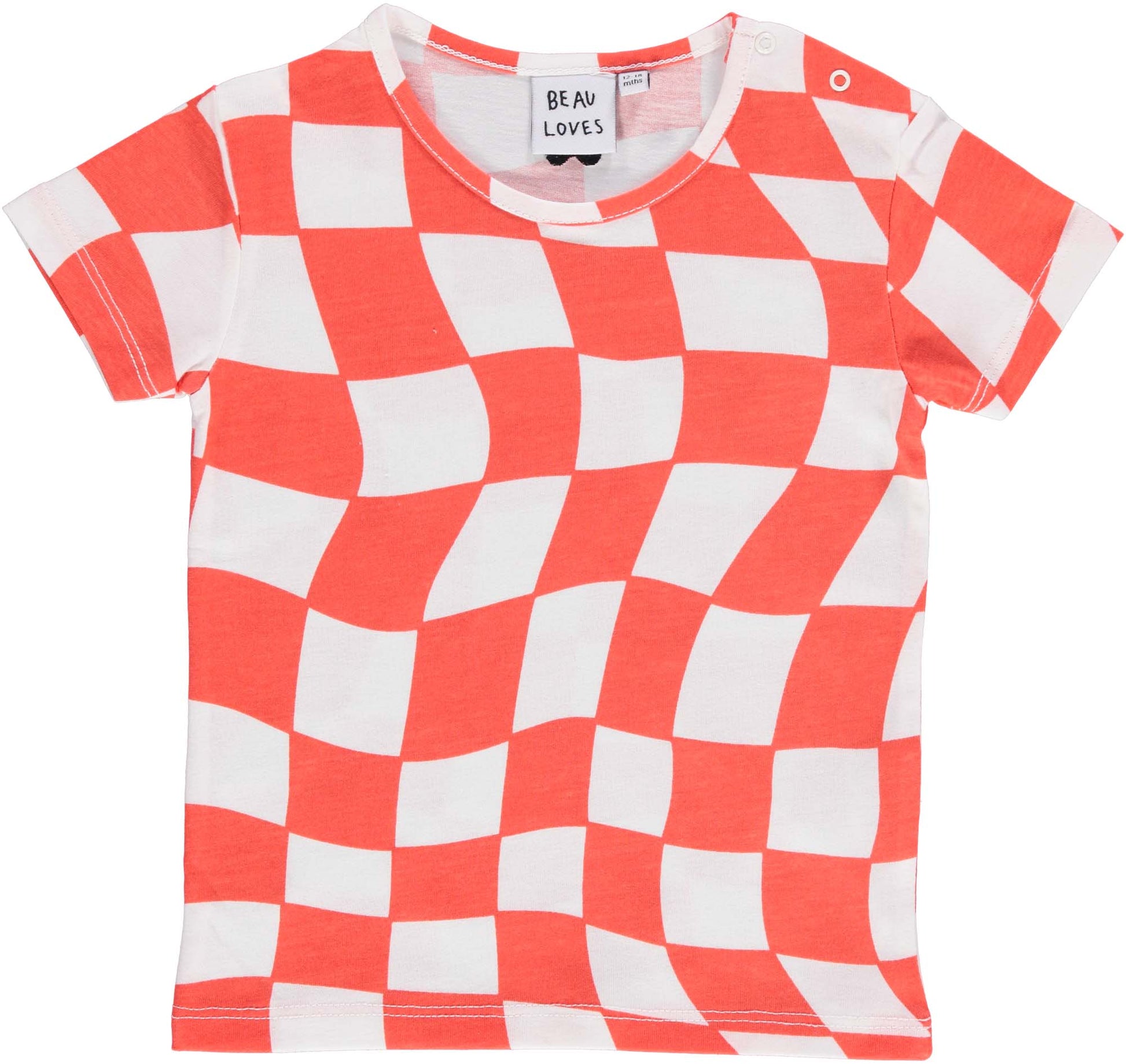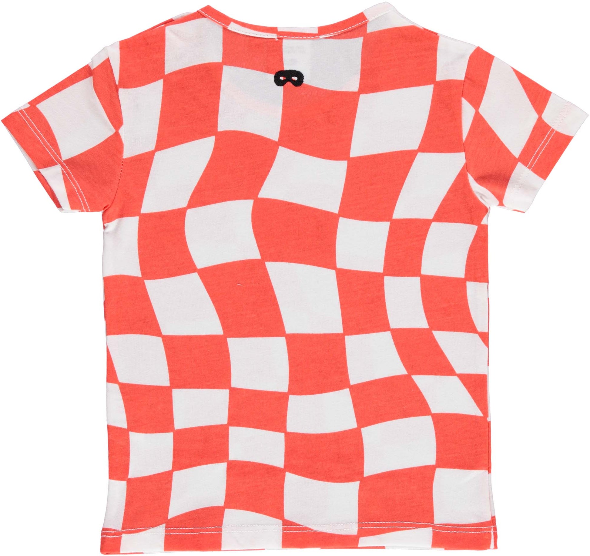 This t-shirt features a rippled check print which has been designed to imitate the distorted pattern seen at the bottom of a swimming pool. Our signature superhero mask is embroidered at the nape of the neck and there are two press buttons on the shoulder to make dressing easy. With short sleeves, a scoop neck and soft, organic cotton, this is the perfect t-shirt for baby explorers.