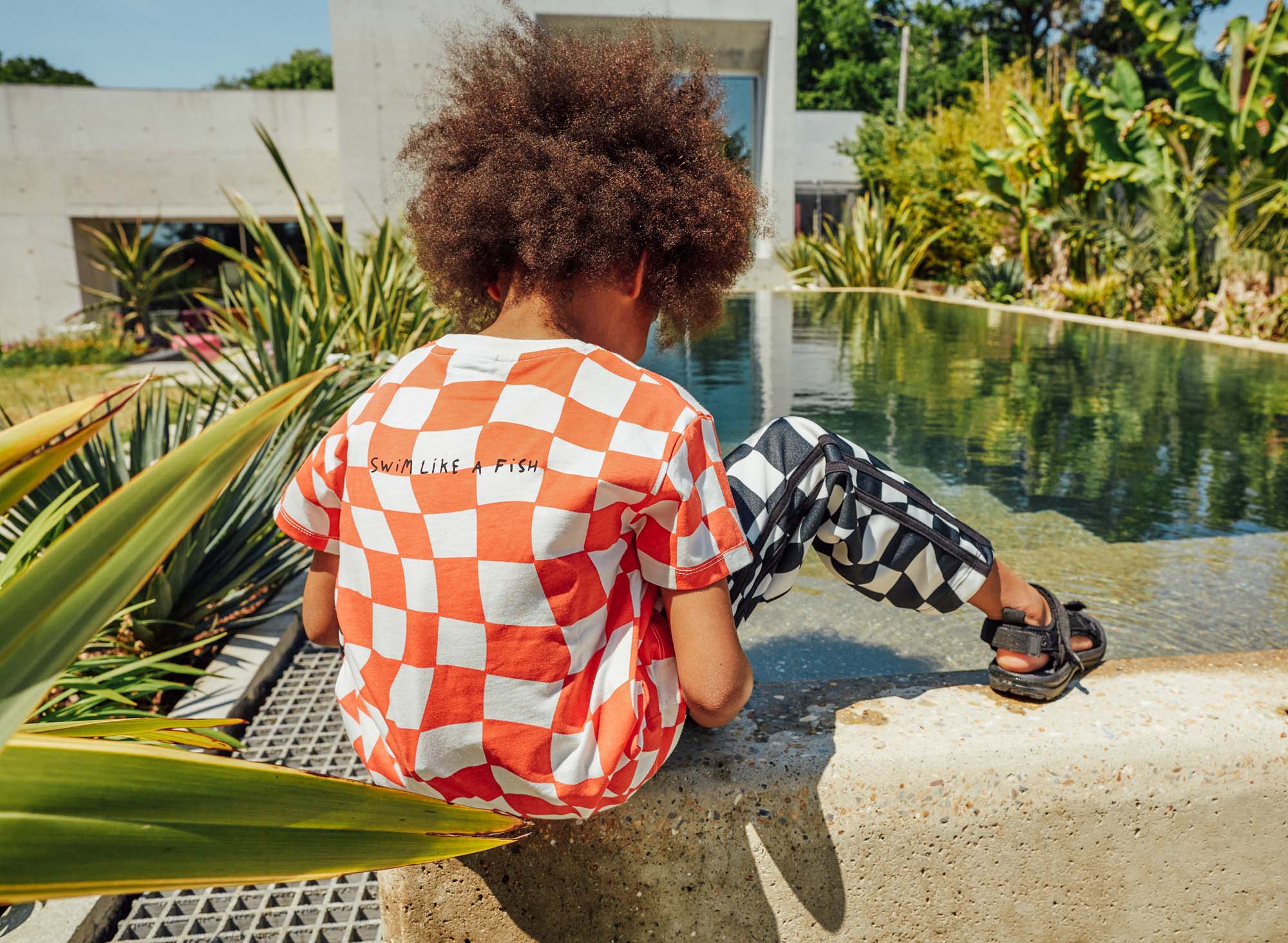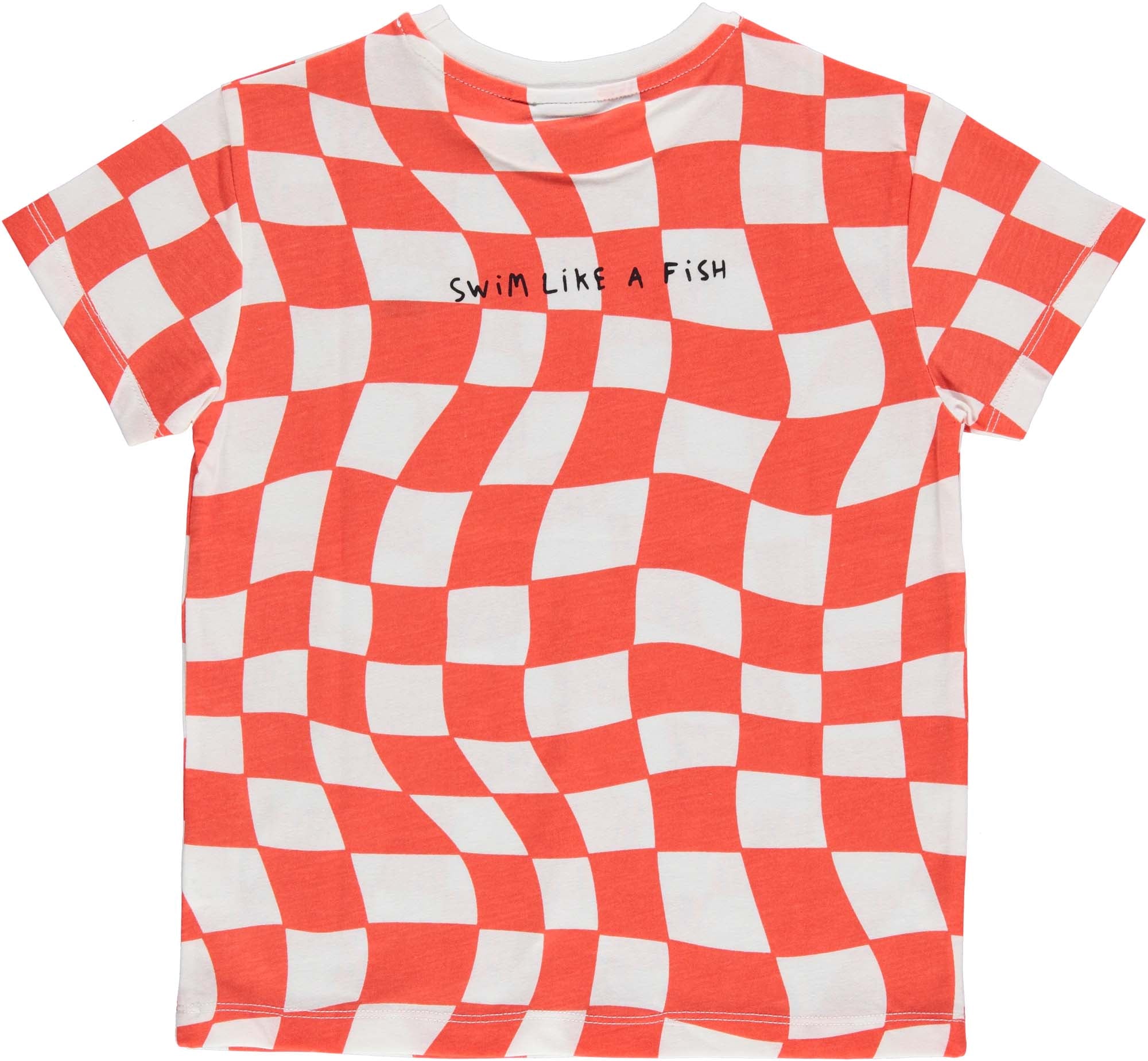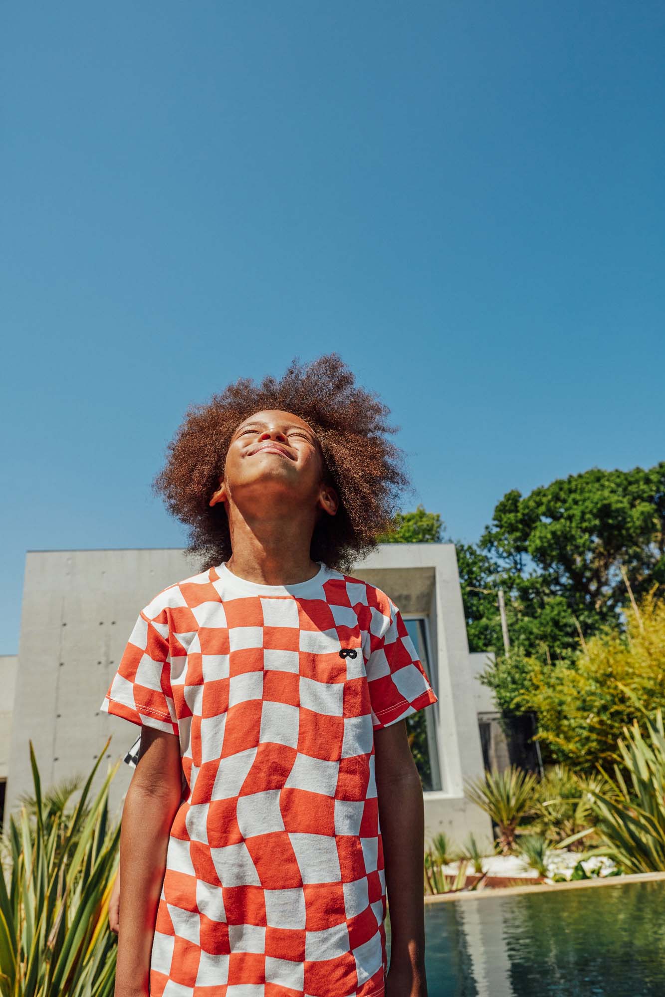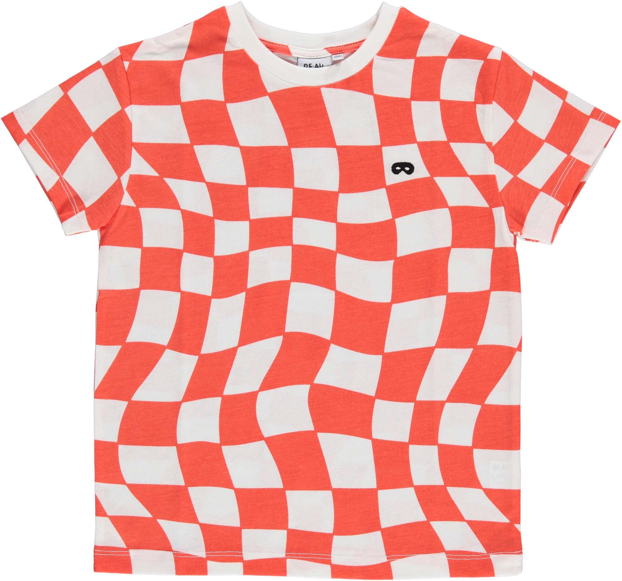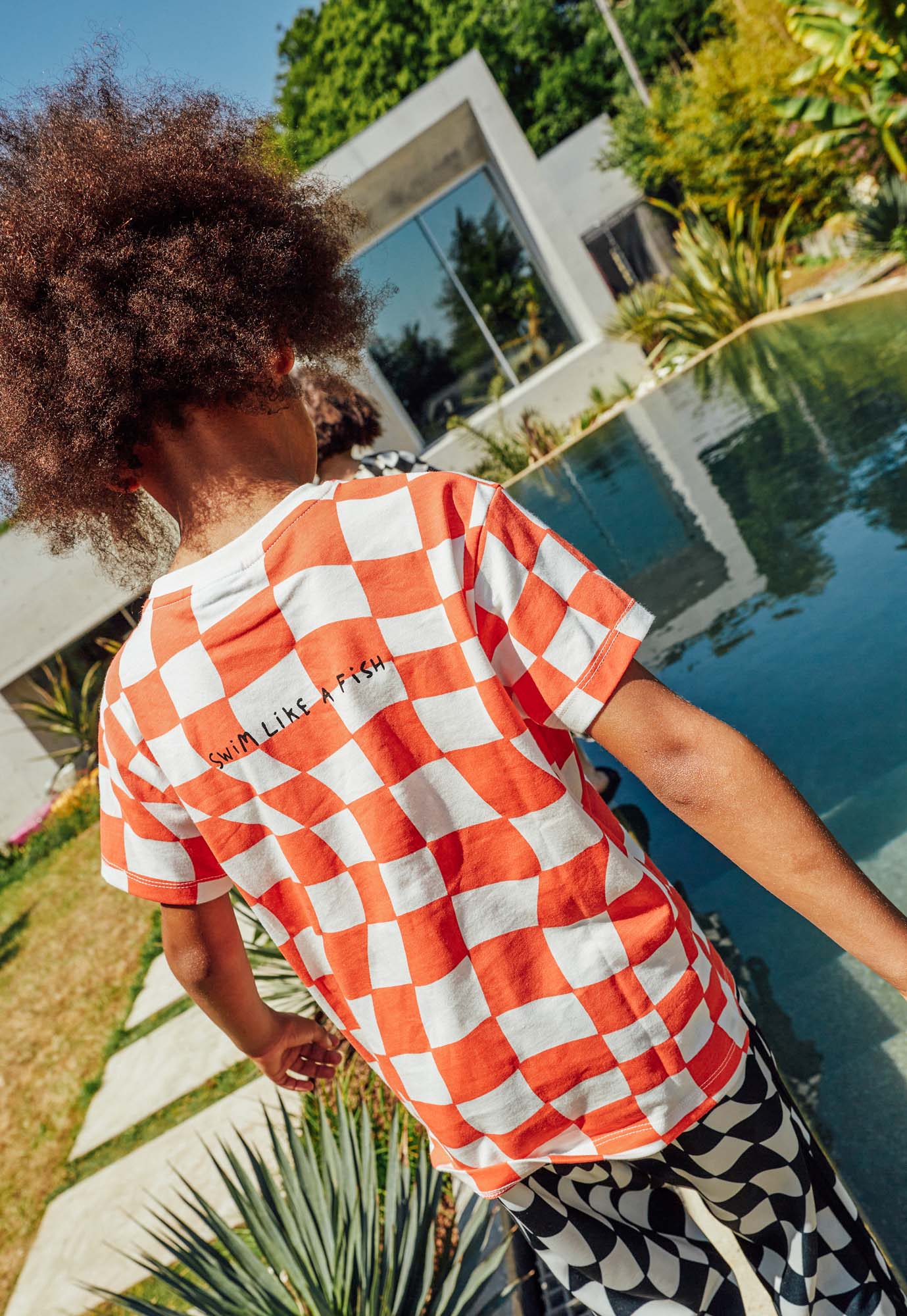 This t-shirt features a rippled check print which has been designed to imitate the distorted pattern seen at the bottom of a swimming pool. It is designed in a classic fit and it features a ribbed collar and short sleeves. Our signature embroidered superhero mask is at the nape of the neck.
