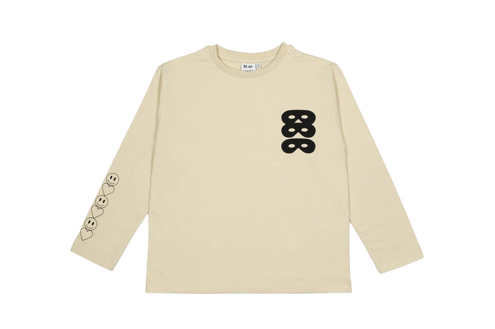 Made from organic cotton, this classic fit, long sleeve t-shirt features three hero masks on the front, small heart and smiley face prints down the right sleeve and '2010' - the date Beau Loves started - on the back written in Beau's handwriting. Easy to wear and easy to care for.
