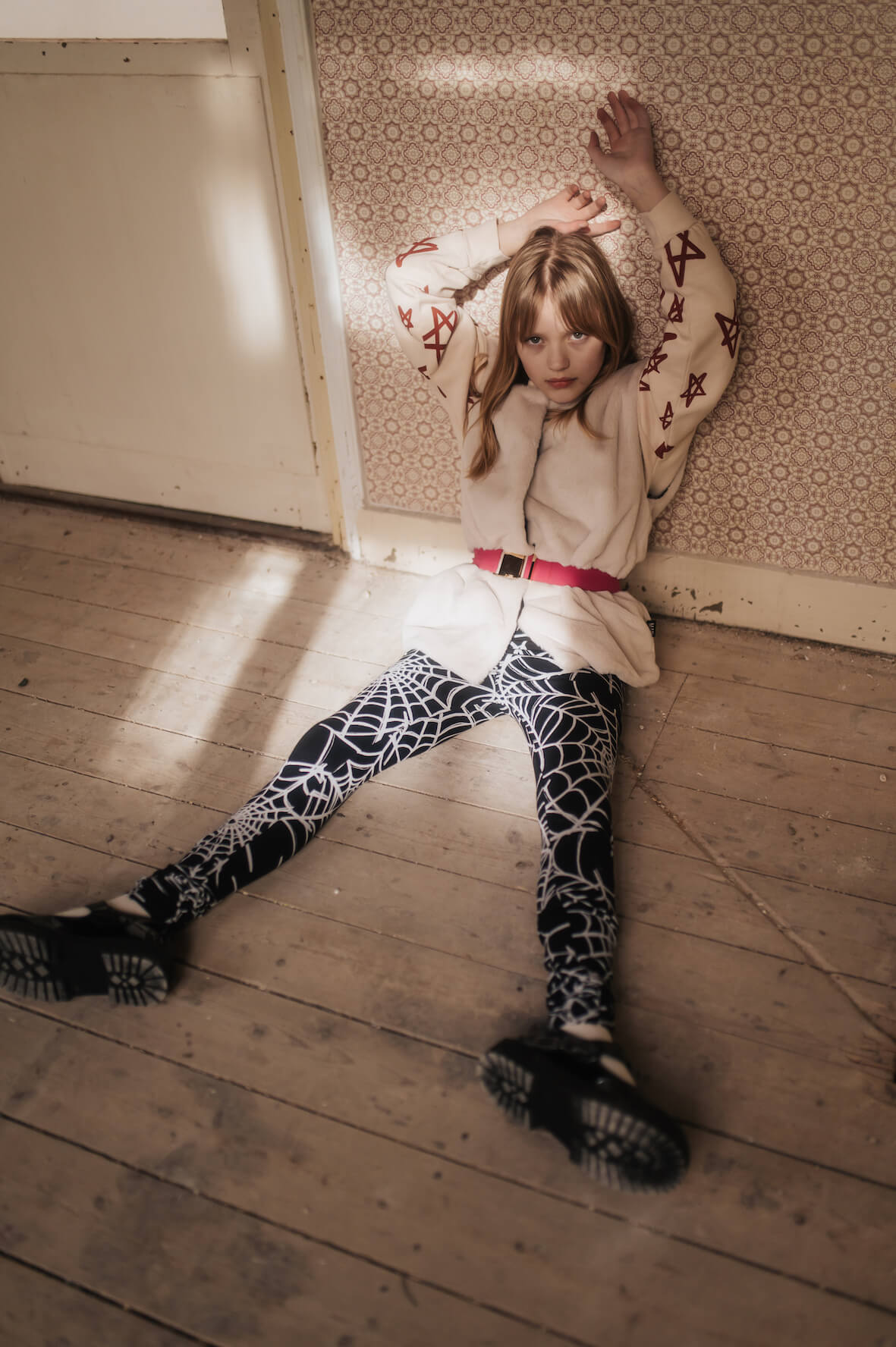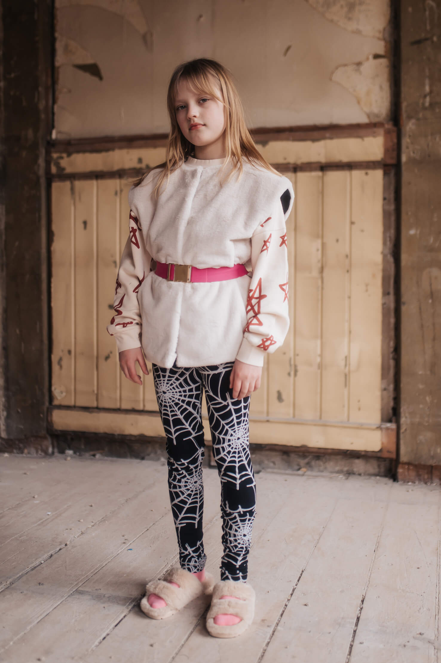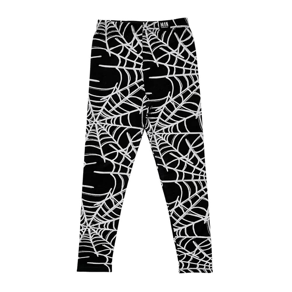 The popular black white leggings for kids. Introducing our cool and edgy black kidswear leggings, perfect for your little trendsetters who love streetwear with a hint of spookiness! These comfortable and unisex leggings feature an eye-catching spider web allover print that adds a touch of mystery and style to any outfit.
