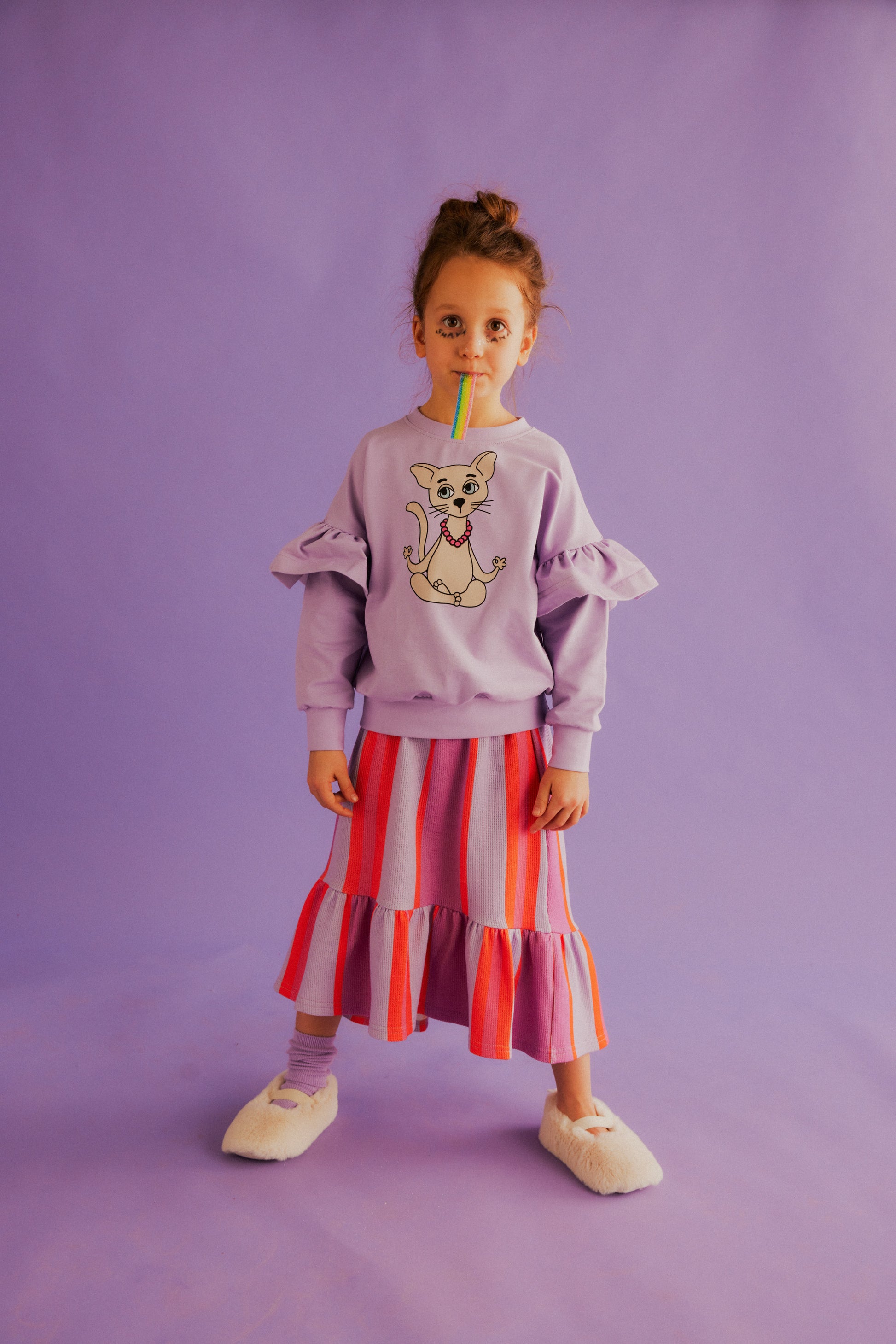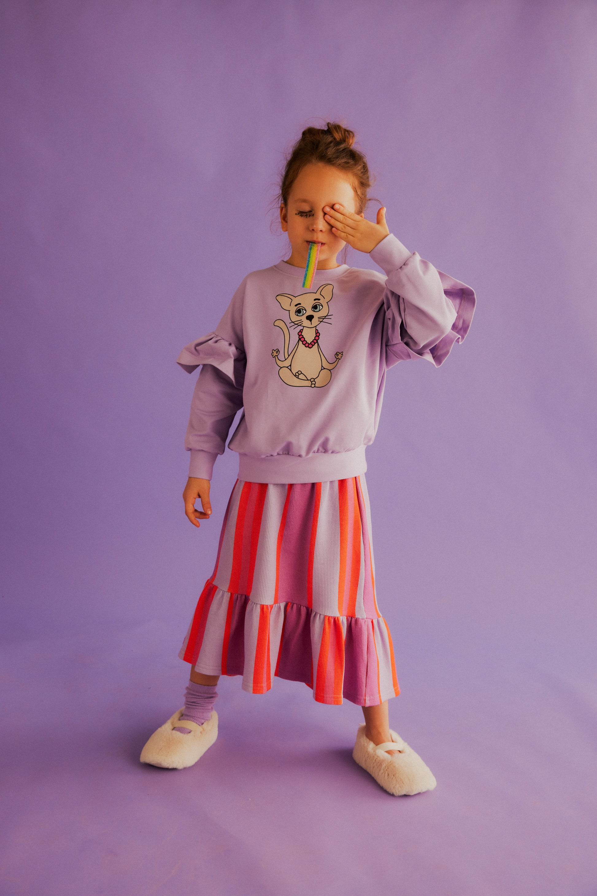 Not sure how to style it? Try it with literally everything. As the shape is really simple, the skirt looks great with both longer back in hoodie, a blouse with puffy sleeves, as well as with a t-shirt and a bomber jacket. Create all-over-printed outfits by pairing the skirt with same capsule’s top or go for something more basic by combining printed bottom with plain top.