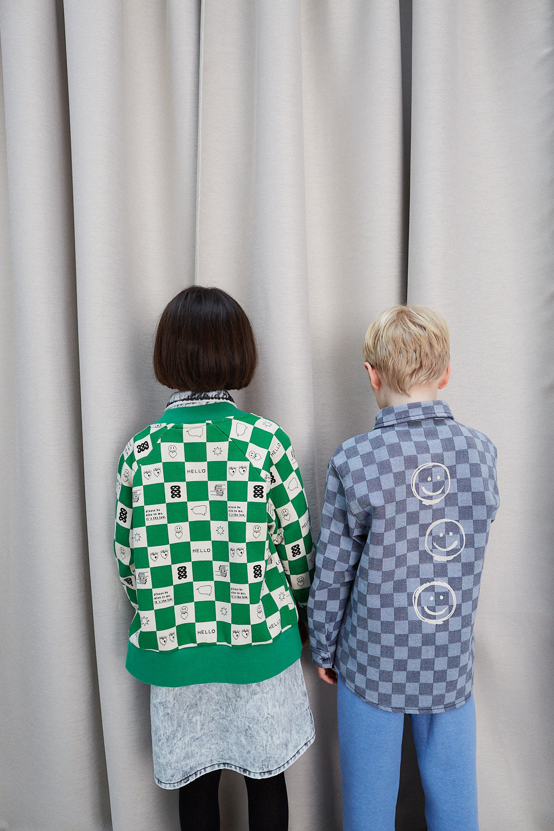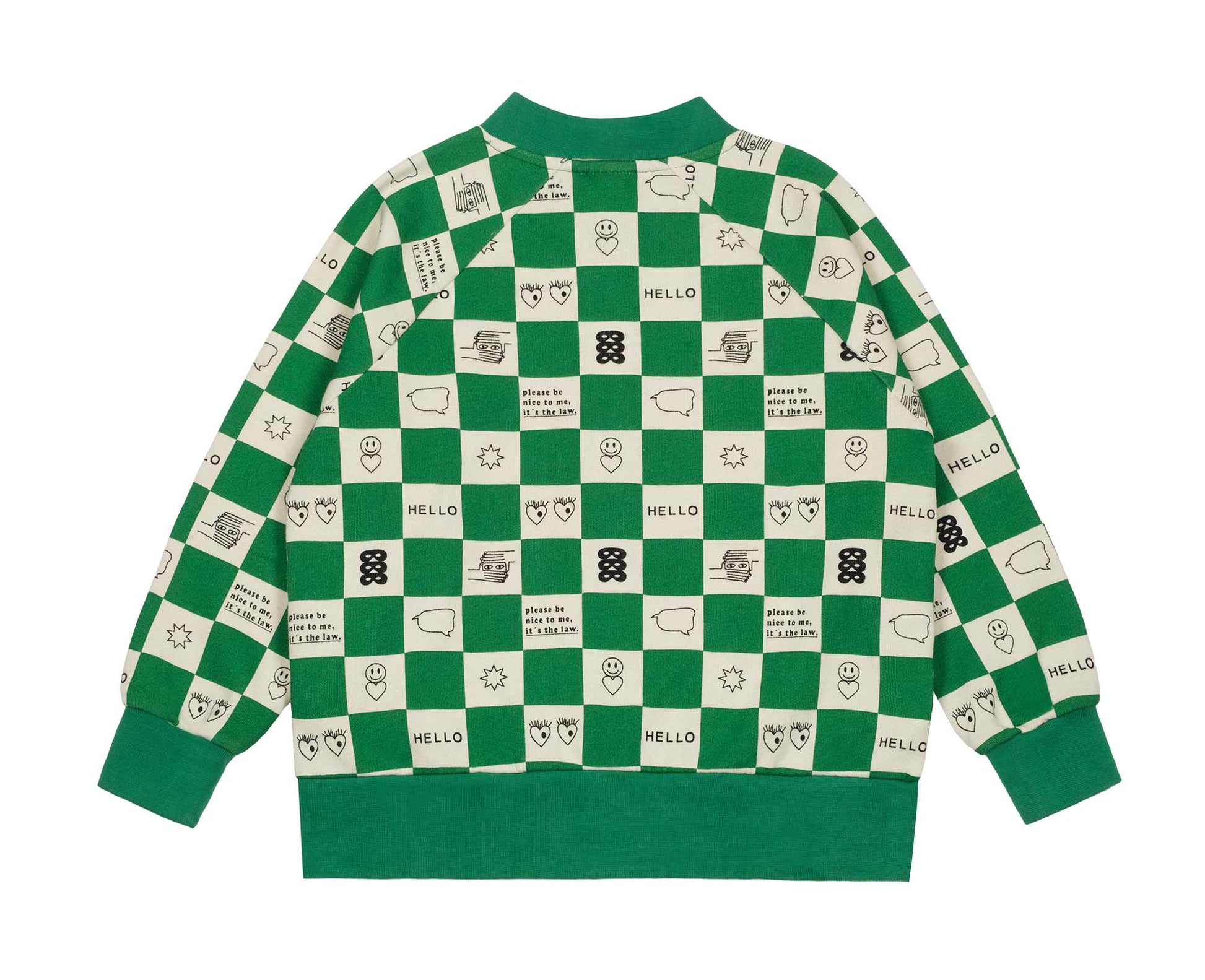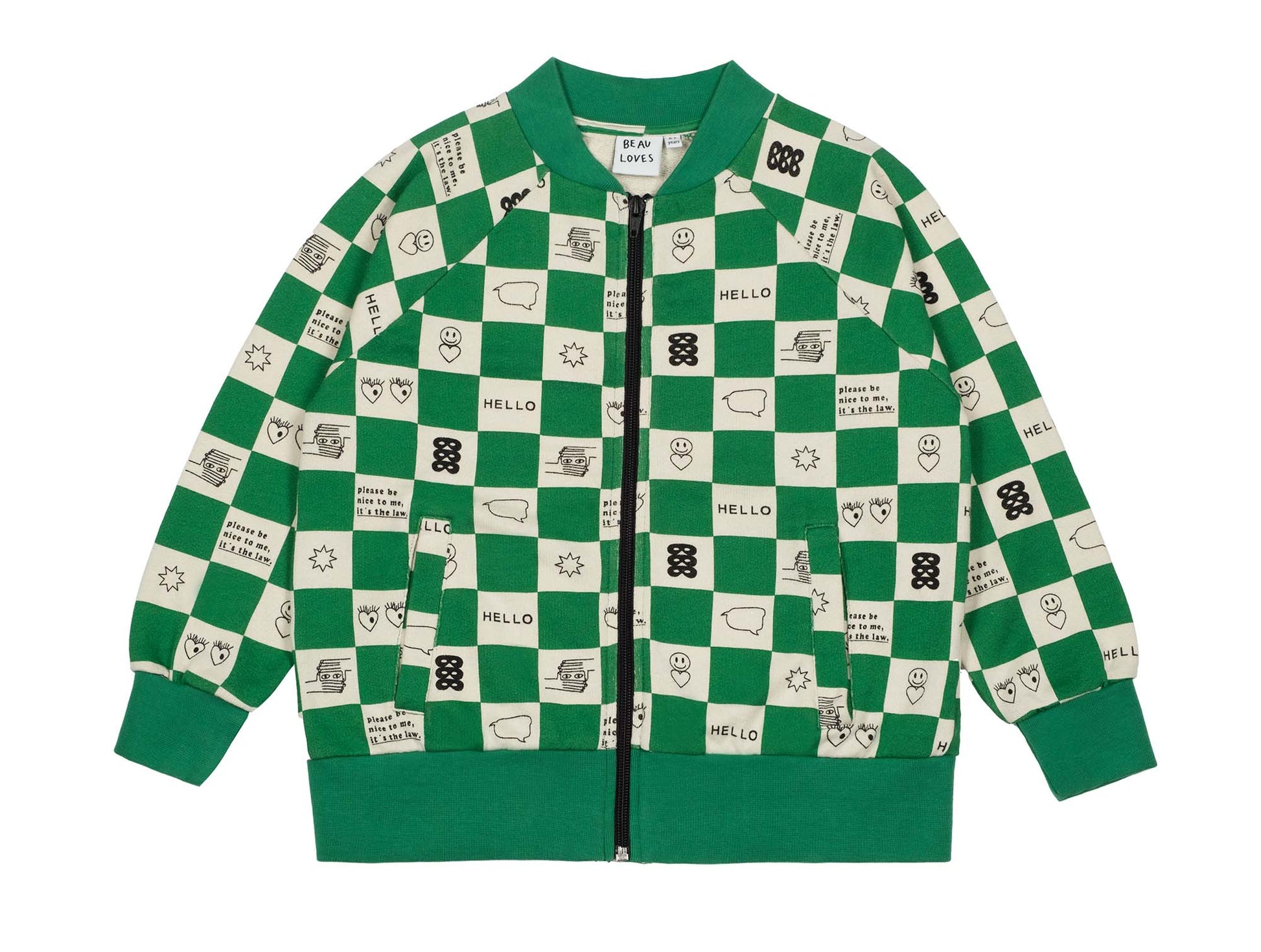 Find the little drawings hidden in each of the comic book checks of this zip up sweater jacket - great for layering and adventures. Made from organic and recycled cotton, this jacket is designed with a ribbed collar, cuffs and hem, and a full zip. Go have fun!