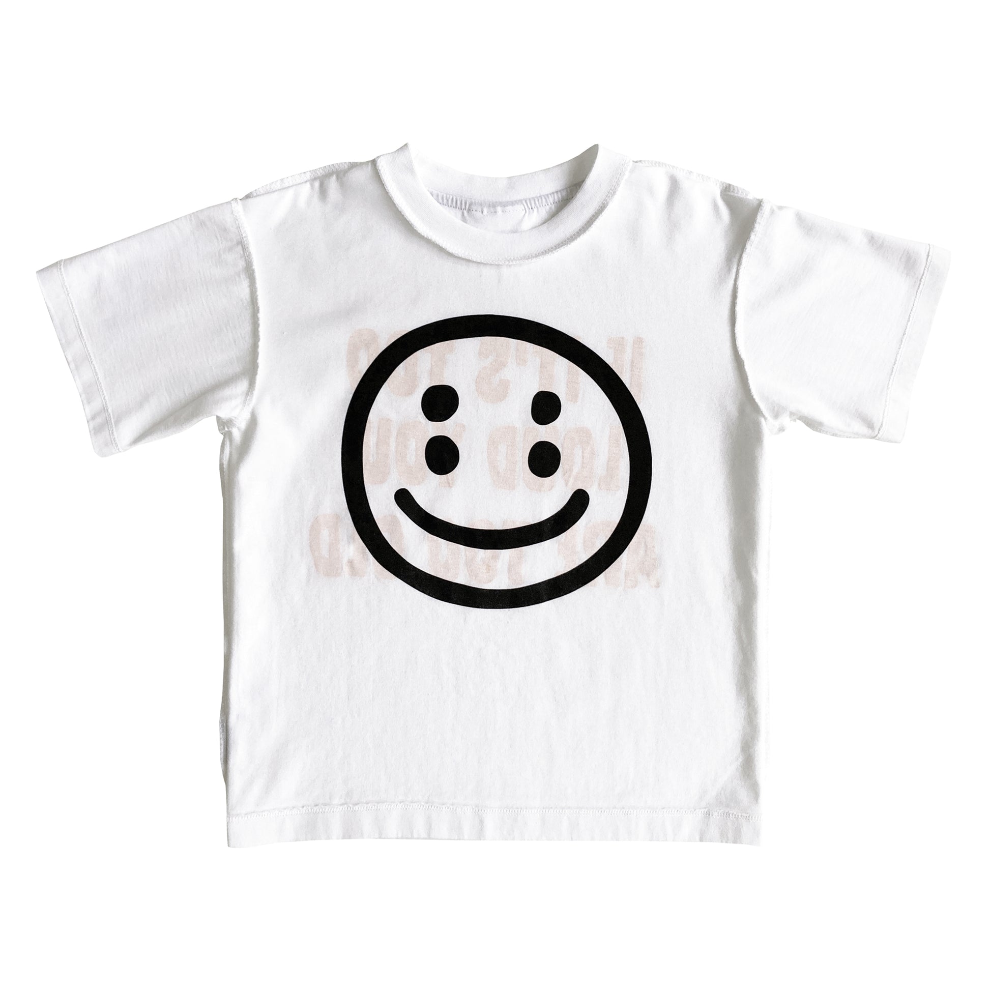 'YOU ARE TOO OLD' placement print at front, LMH SMILEY at reversible side.